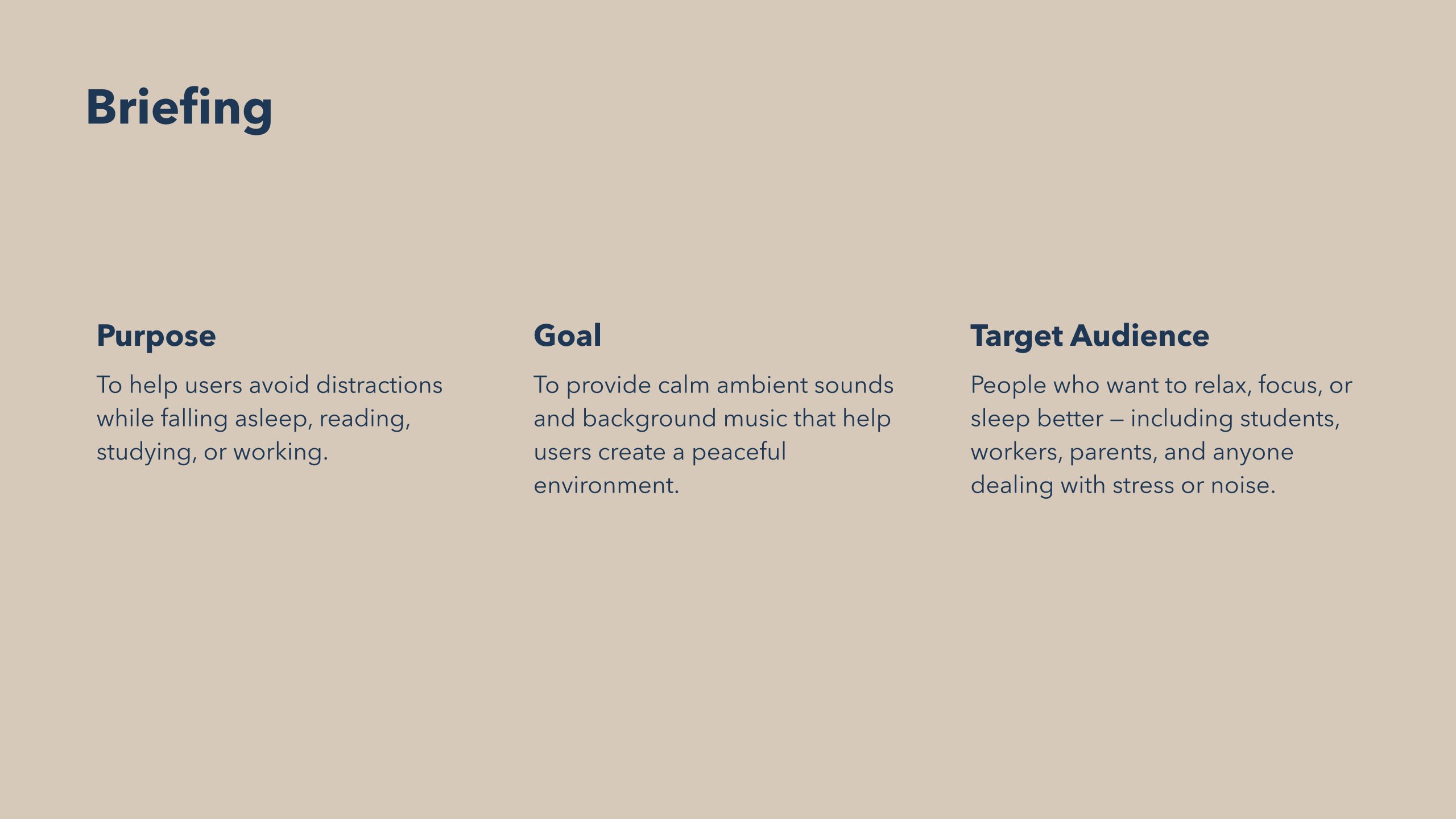 Since this was a classroom project, I did not conduct formal user interviews. Instead, I explored existing background audio apps such as Headspace, Tide, and Endel. By reviewing their features, structure, and visual styles, I was able to identify common patterns and user needs. I also considered everyday situations where people seek calm, such as reading, studying, or falling asleep.