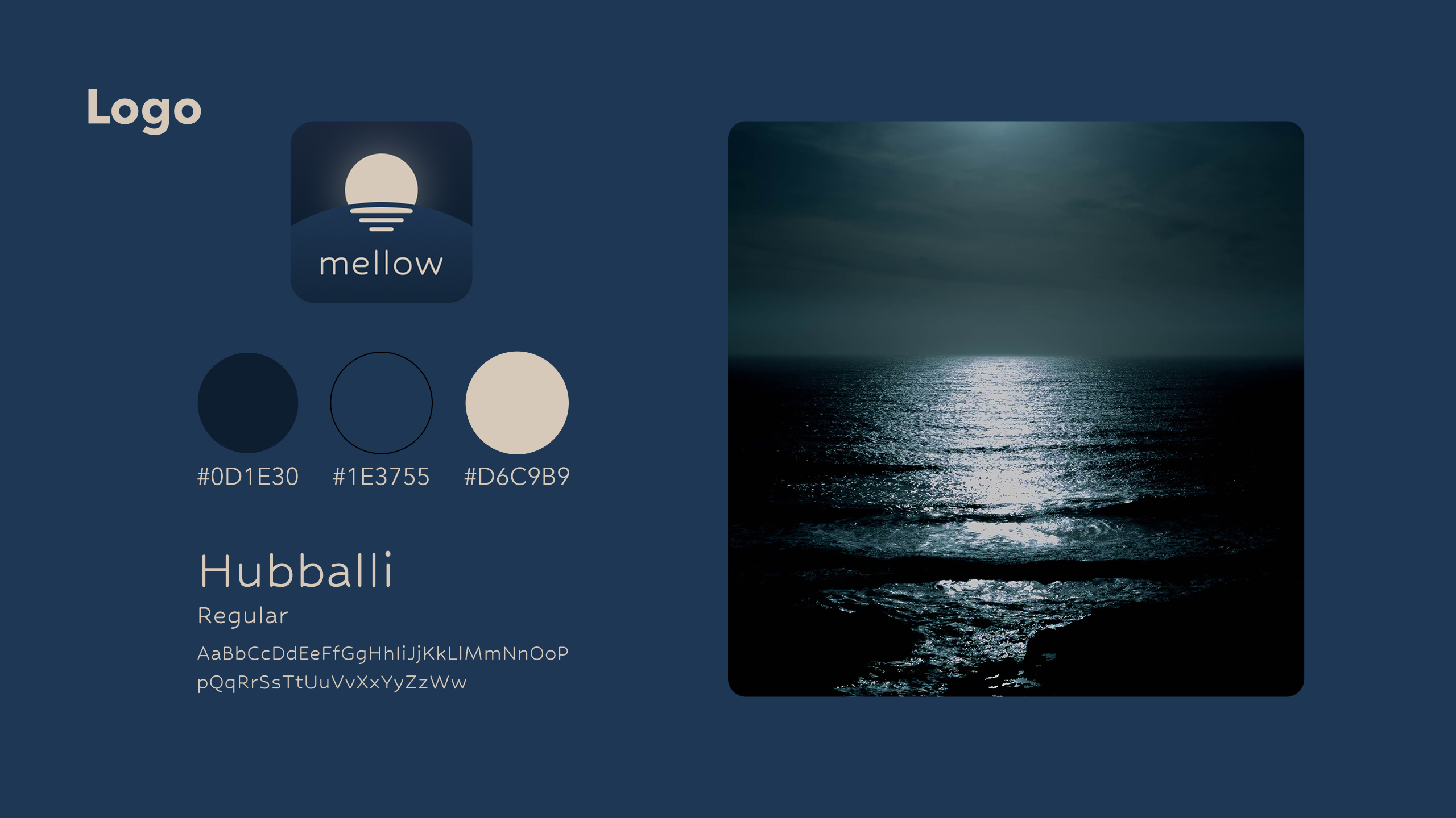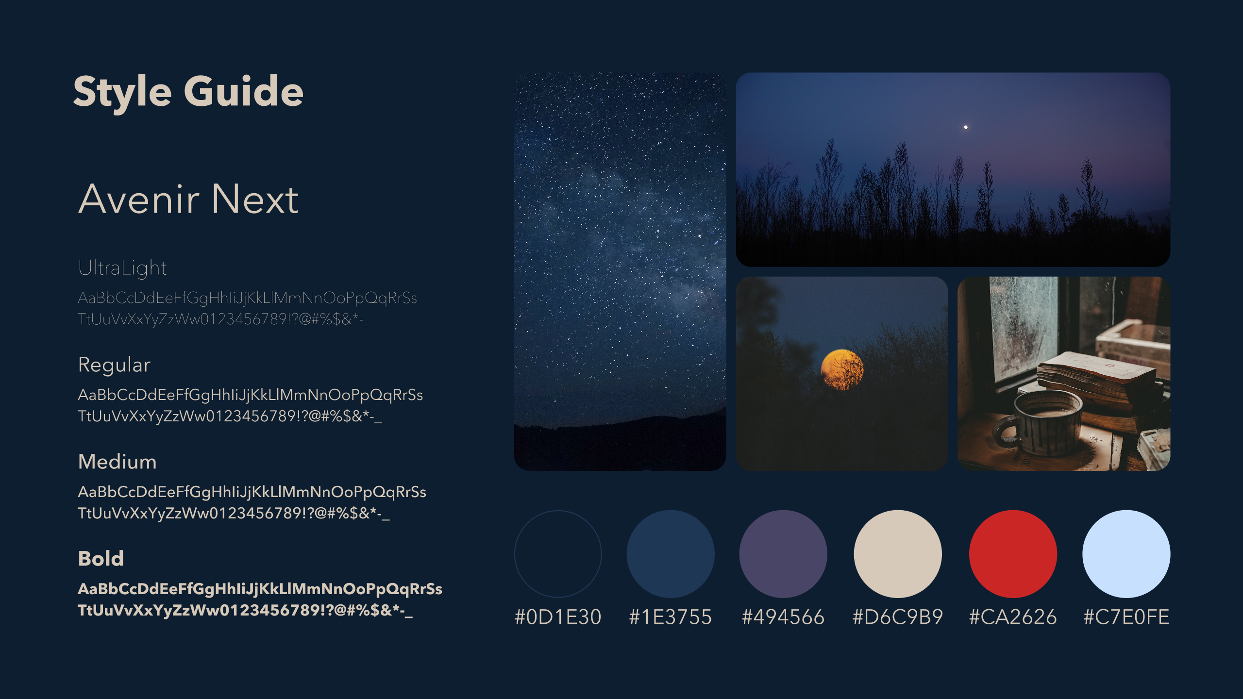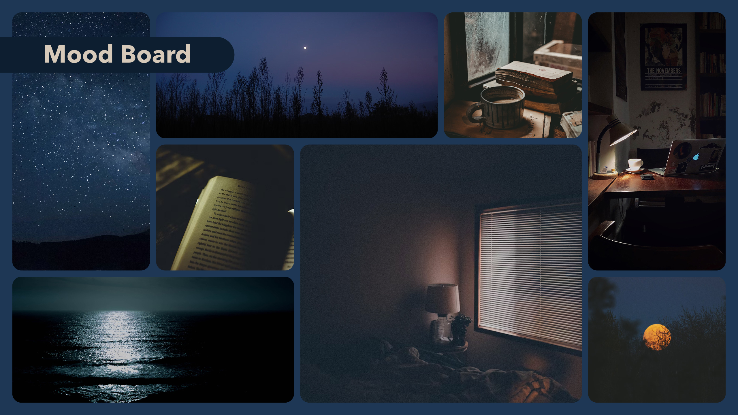 I began the design process with hand-drawn sketches to explore layout ideas. After that, I created wireframes in Figma to define the user flow and screen structure. To shape the visual identity, I made a mood board featuring night skies, quiet workspaces, and peaceful imagery. I selected Avenir Next as the main typeface because it feels modern and easy to read. I also designed a logo inspired by the reflection of moonlight on the sea and chose colors from my mood board to maintain a calm, consistent tone.