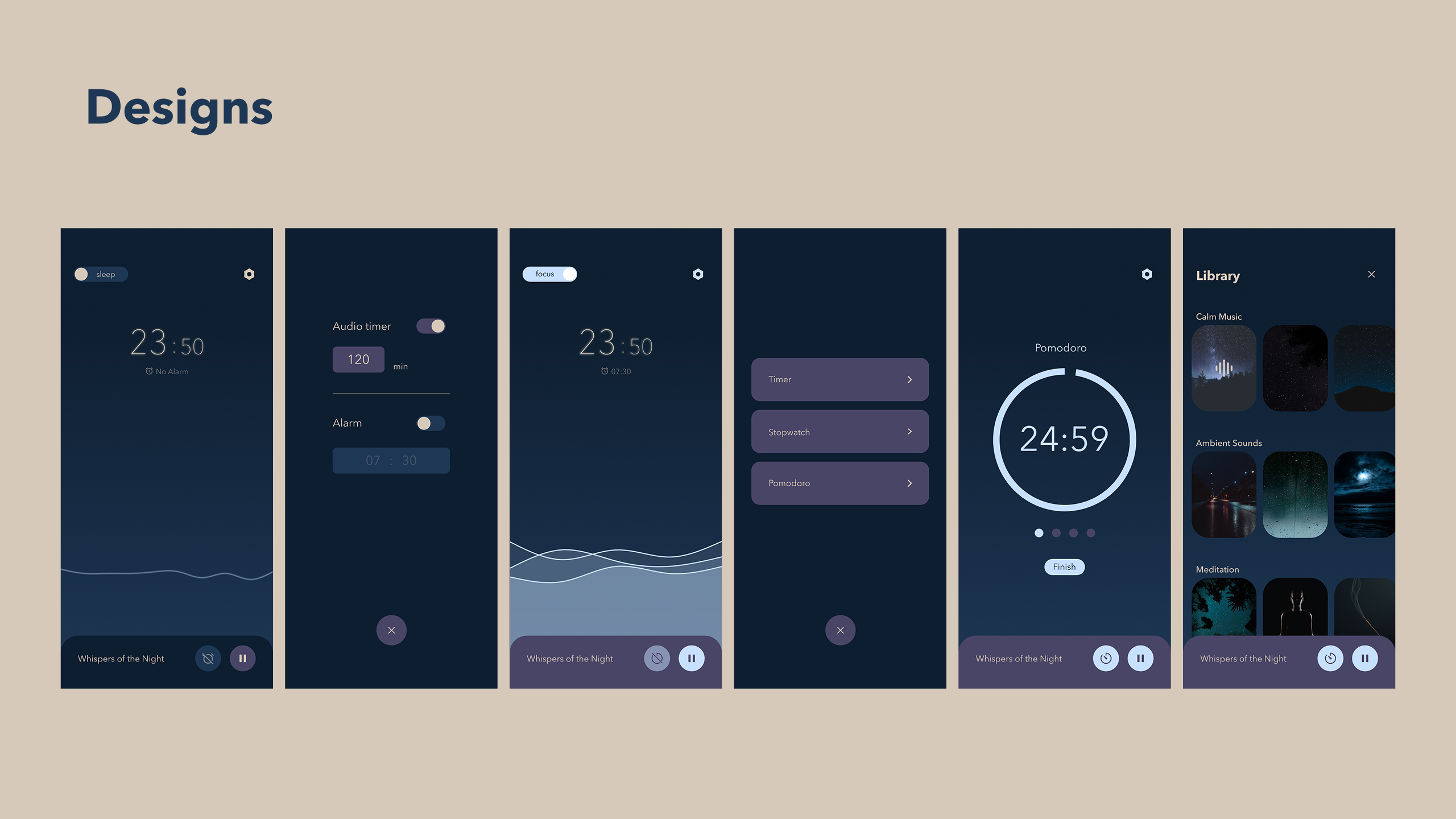 The solution was to design a mobile app that offers calming background audio to help users concentrate or relax. The app provides two experiences, one for sleeping and one for focusing, each with specific features and a unique visual style.