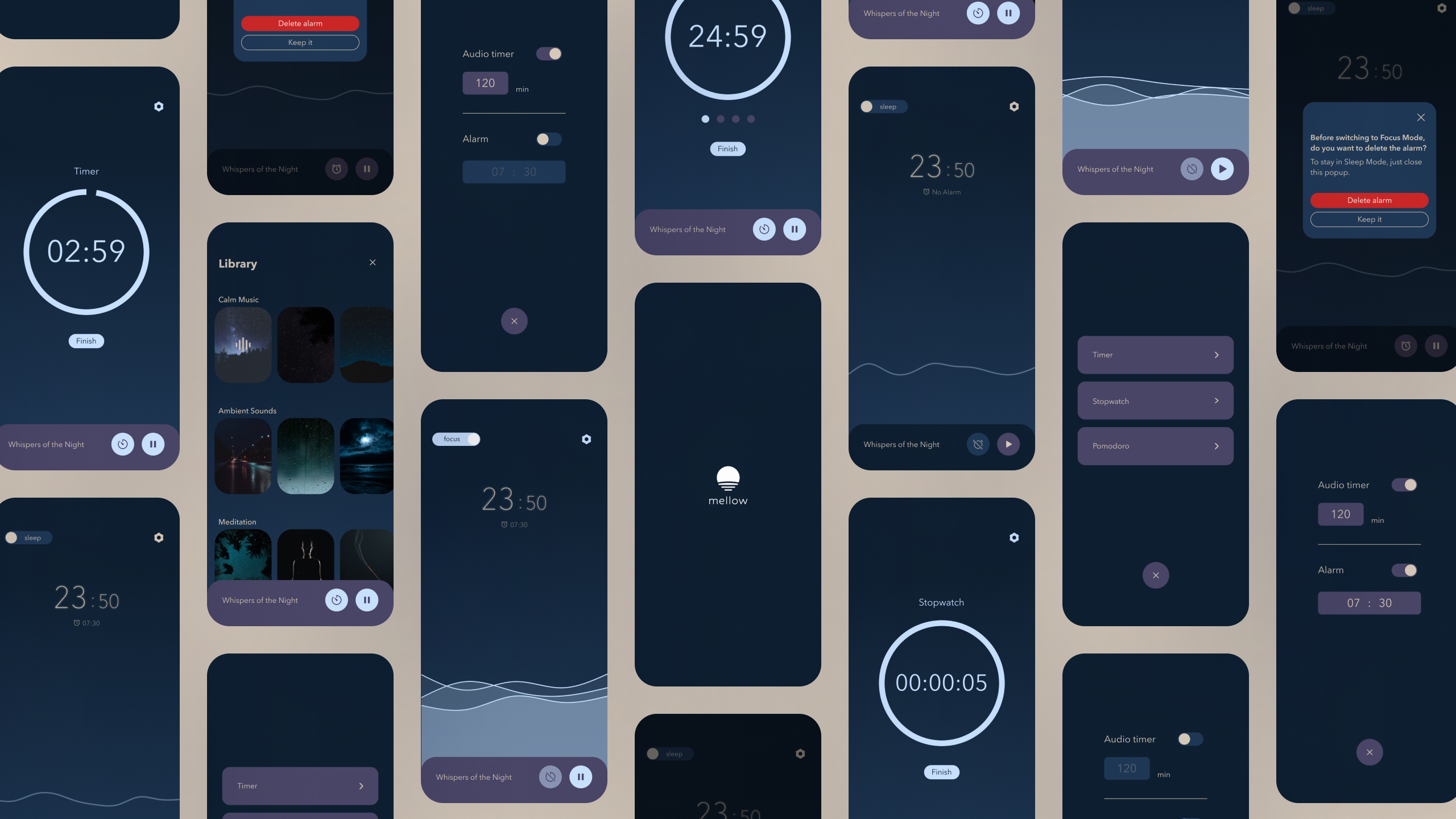 Based on this research, I defined the core structure of the app. Mellow is designed for people who want to relax, focus, or sleep better. This includes students, remote workers, parents, and anyone who deals with stress or noisy environments. I planned two main experiences within the app: Sleep Mode and Focus Mode. I also identified key features such as an audio library, a sleep alarm, and a focus timer.