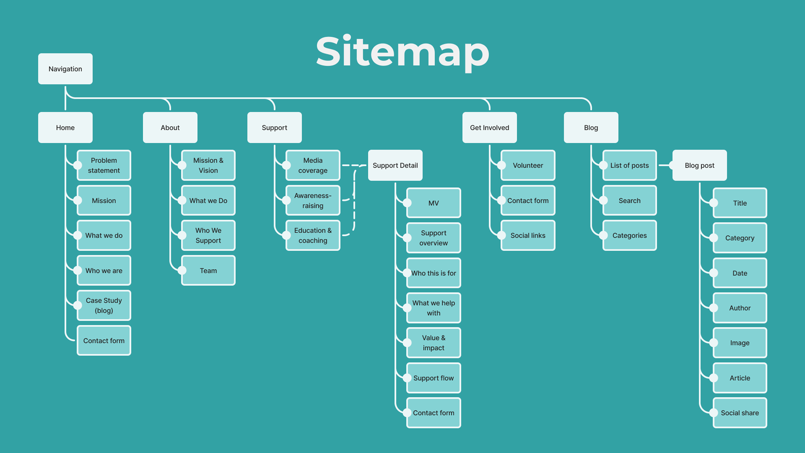 Based on my findings, I created a new sitemap and content structure. I decided to highlight the problem statement, mission, and impact on the homepage. Because the organization is still relatively new and does not yet have many case studies, I chose to include a blog section instead.