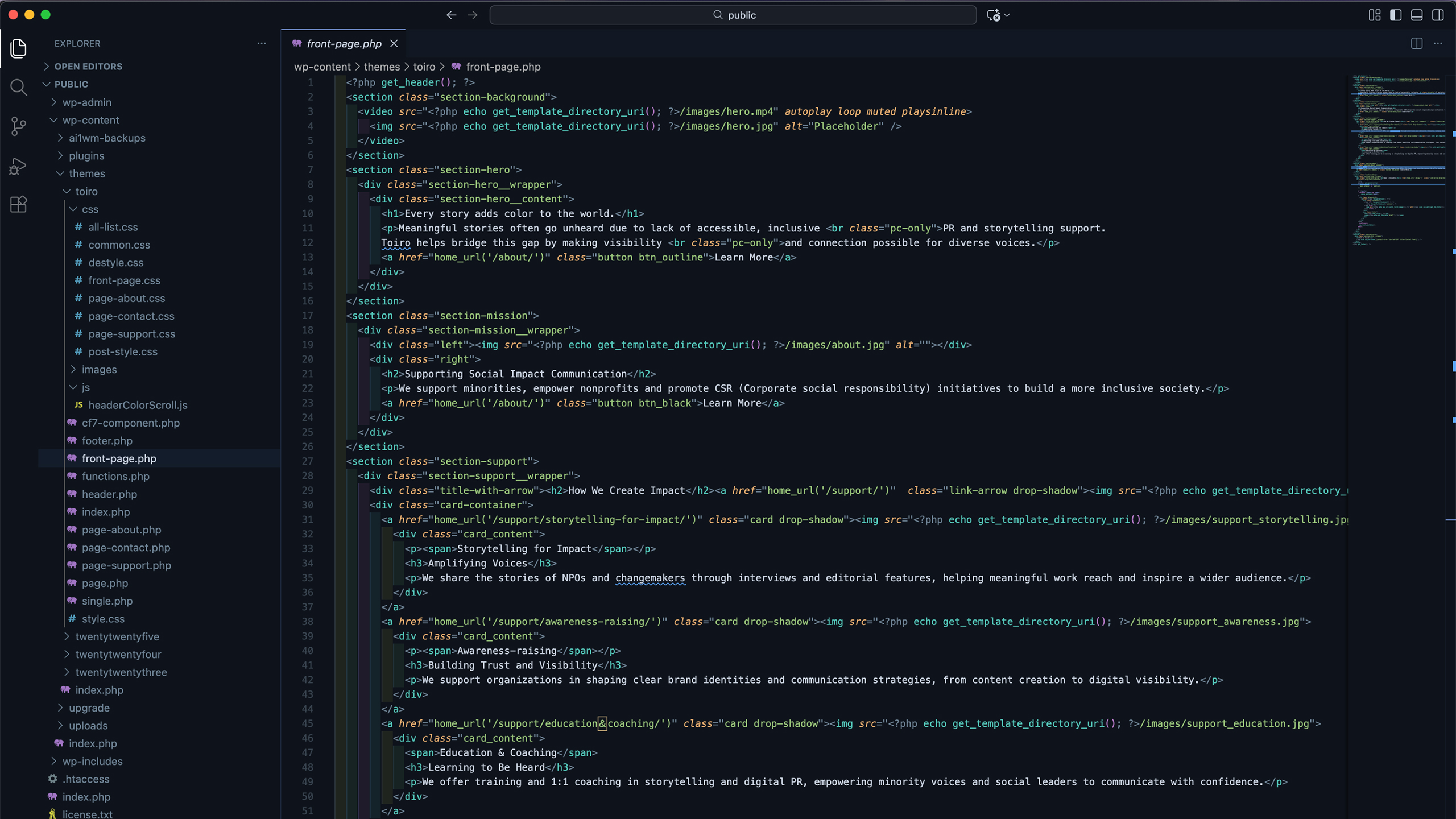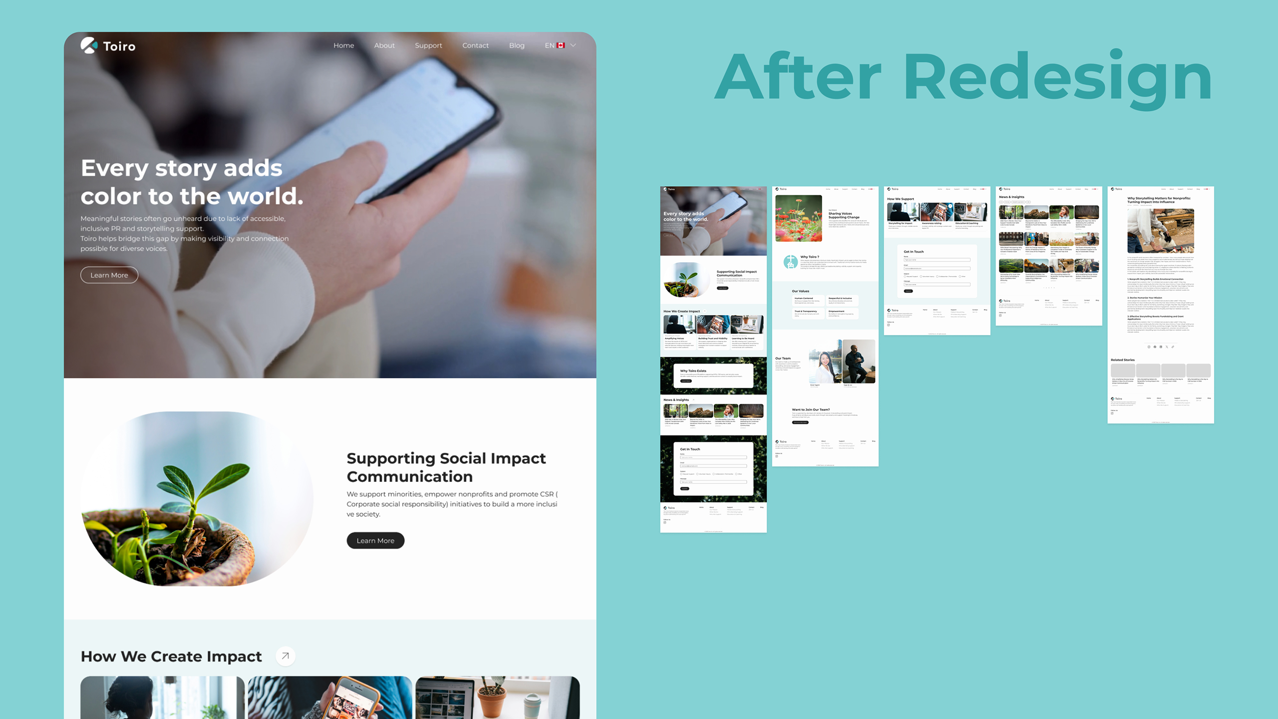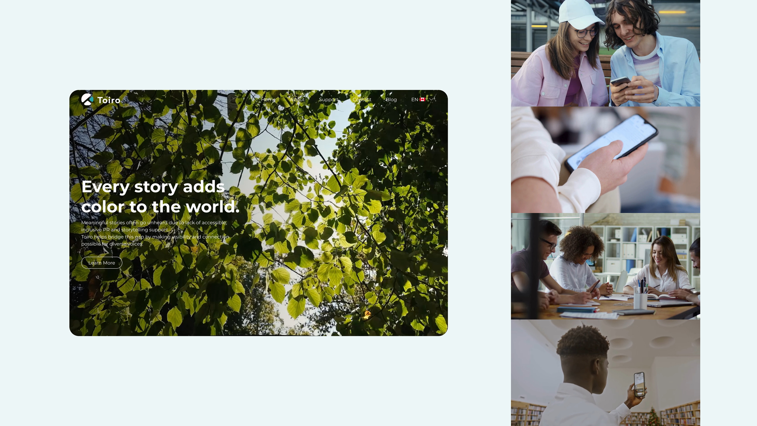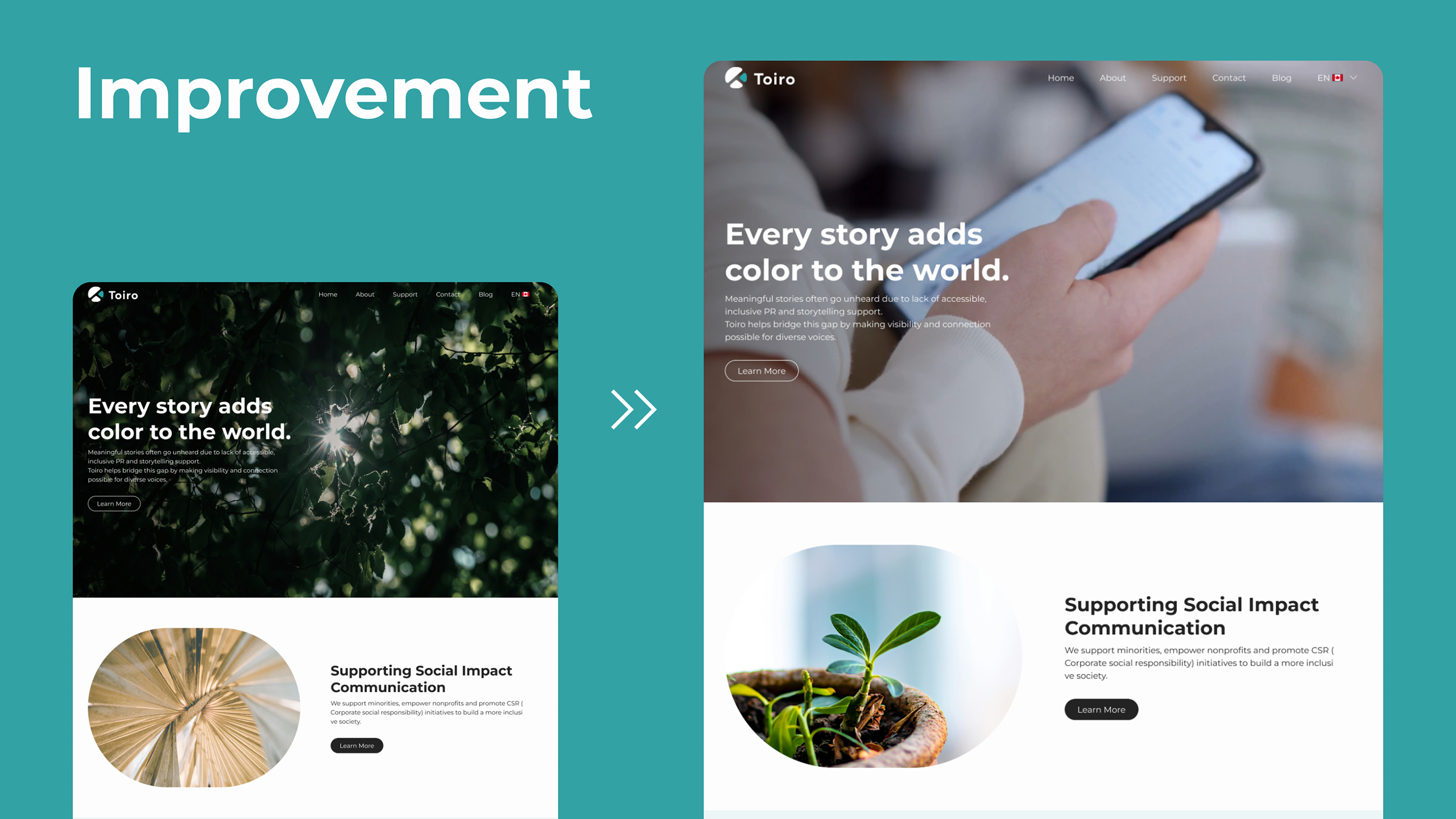 After completing development, I received feedback that some homepage visuals were unclear and not strongly connected to the organization’s services. I explained my design concept based on the meaning of “Toiro”, which translates to “many colors” in Japanese. Sunlight passing through trees reflects multiple colors, similar to a rainbow, which aligns with the organization’s values of diversity and storytelling.